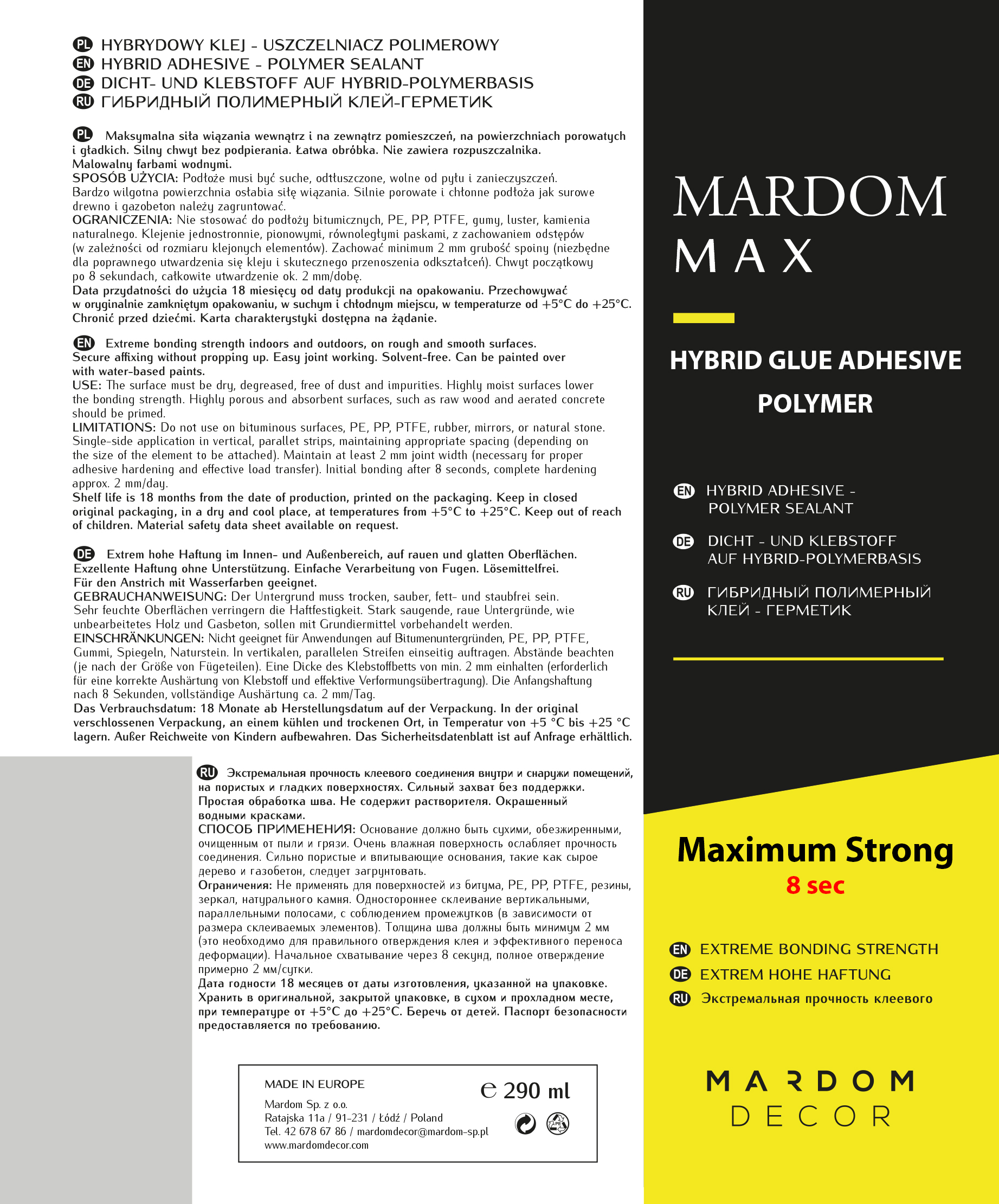 - MATÉRIAU : La colle de montage est exempte de solvants.