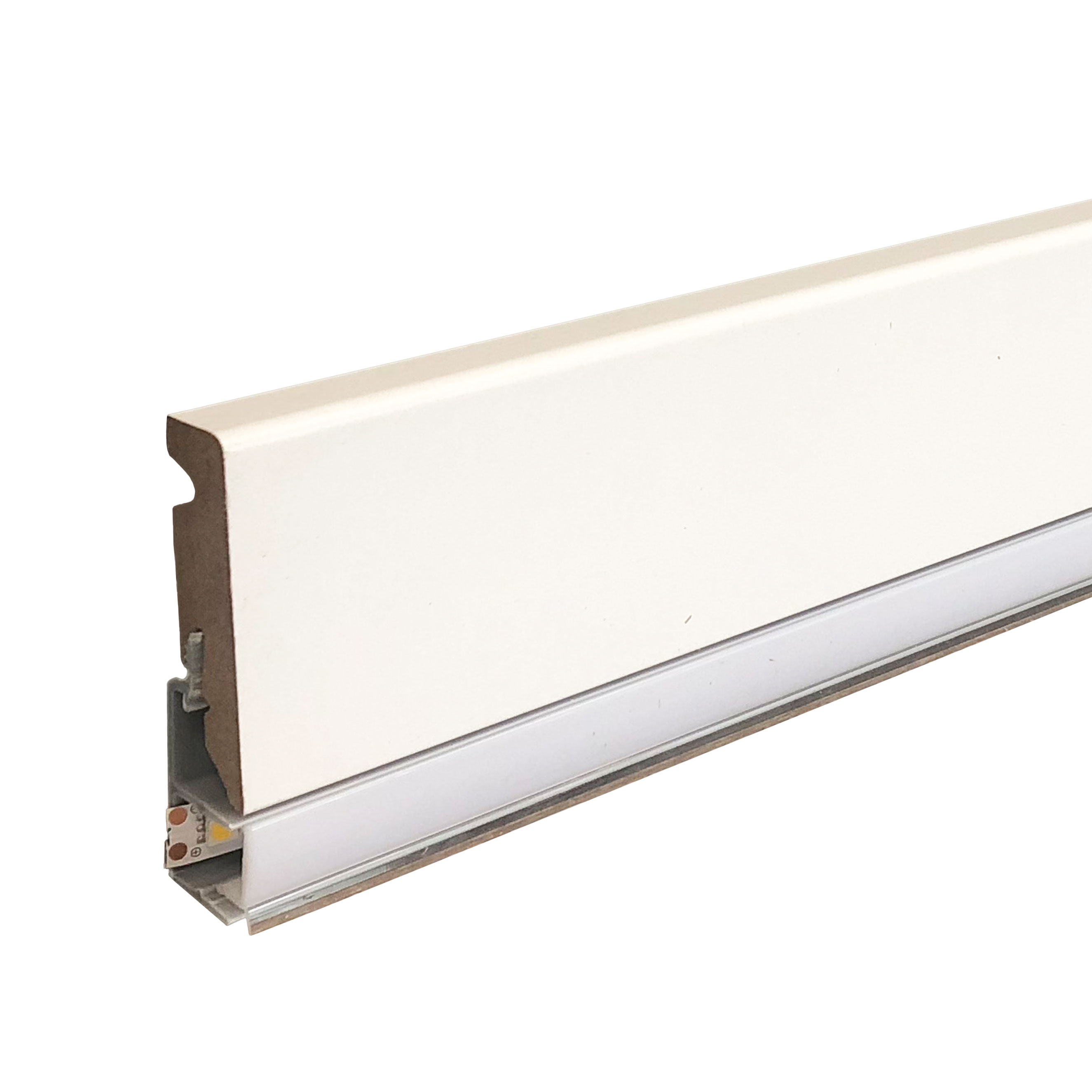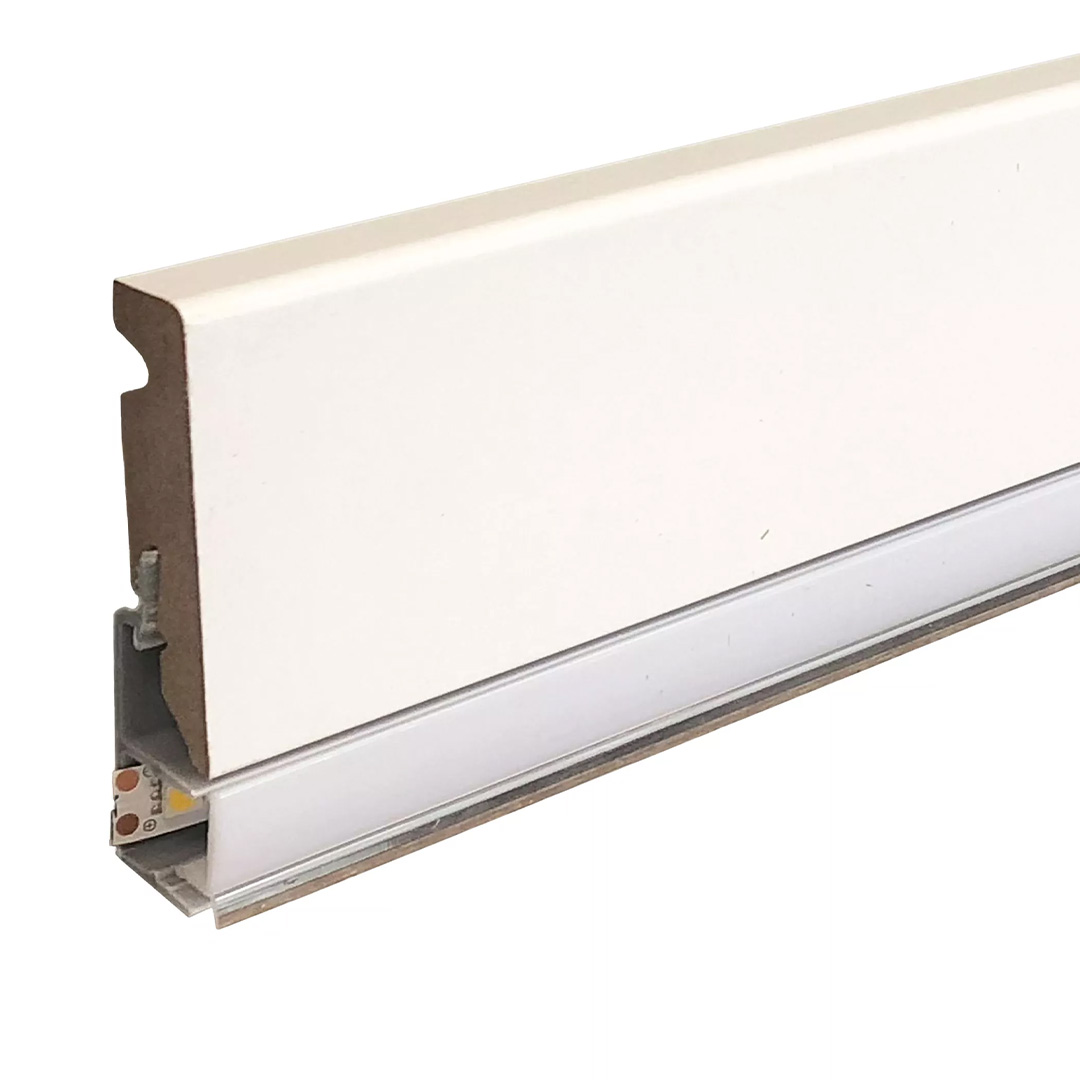 Klassische weiße Sockelleiste zur indirekte Beleuchtung, bezogen mit Folie (15 x 73 x 2400 mm)