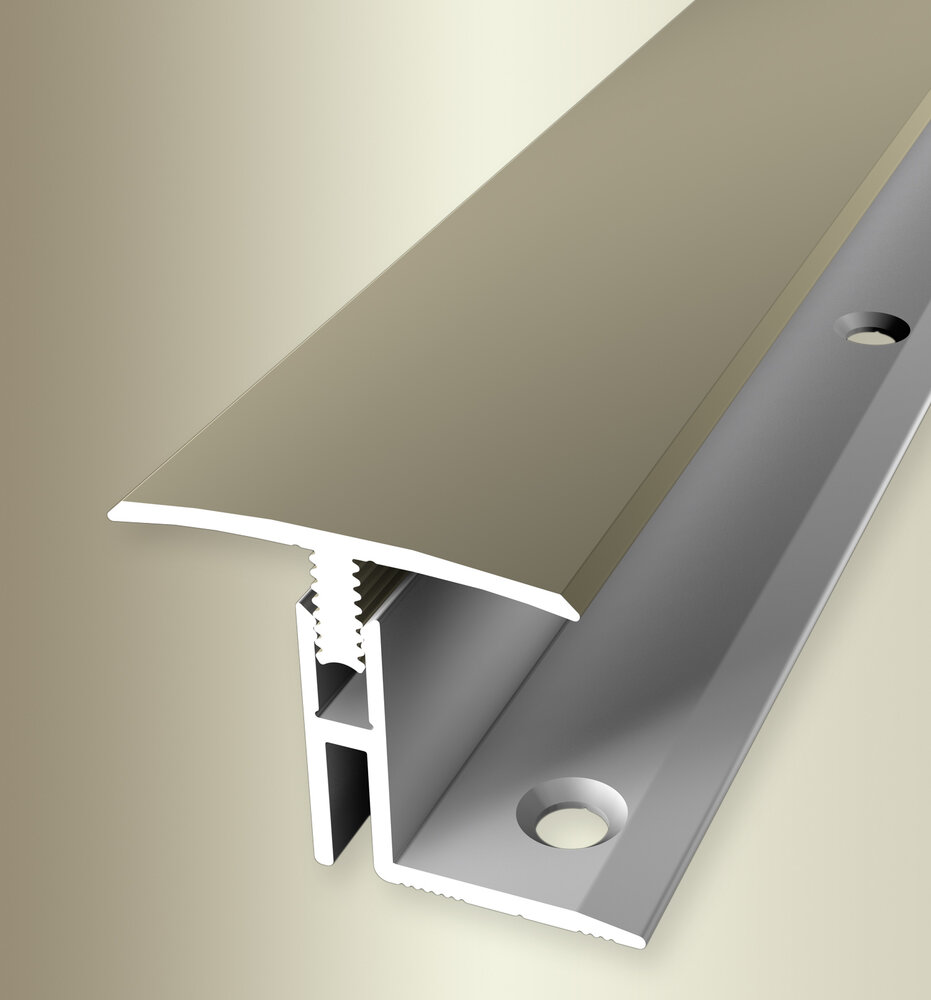 Cette barre de seuil en deux pièces, appelé Mono-Clip, est spécialement conçu pour permettre une dilatation plus importante avec un profilé étroit. Le design des profilés est très élégant avec une surface lisse et élégante. La barre de seuil est adaptée à tous les revêtements de sol durs de 7-12 mm, 12-17 mm et 17-22 mm. Dans la série Mono-Clip, il existe des profilés de rattrapage, des profilés de finition et des barres de seuil.