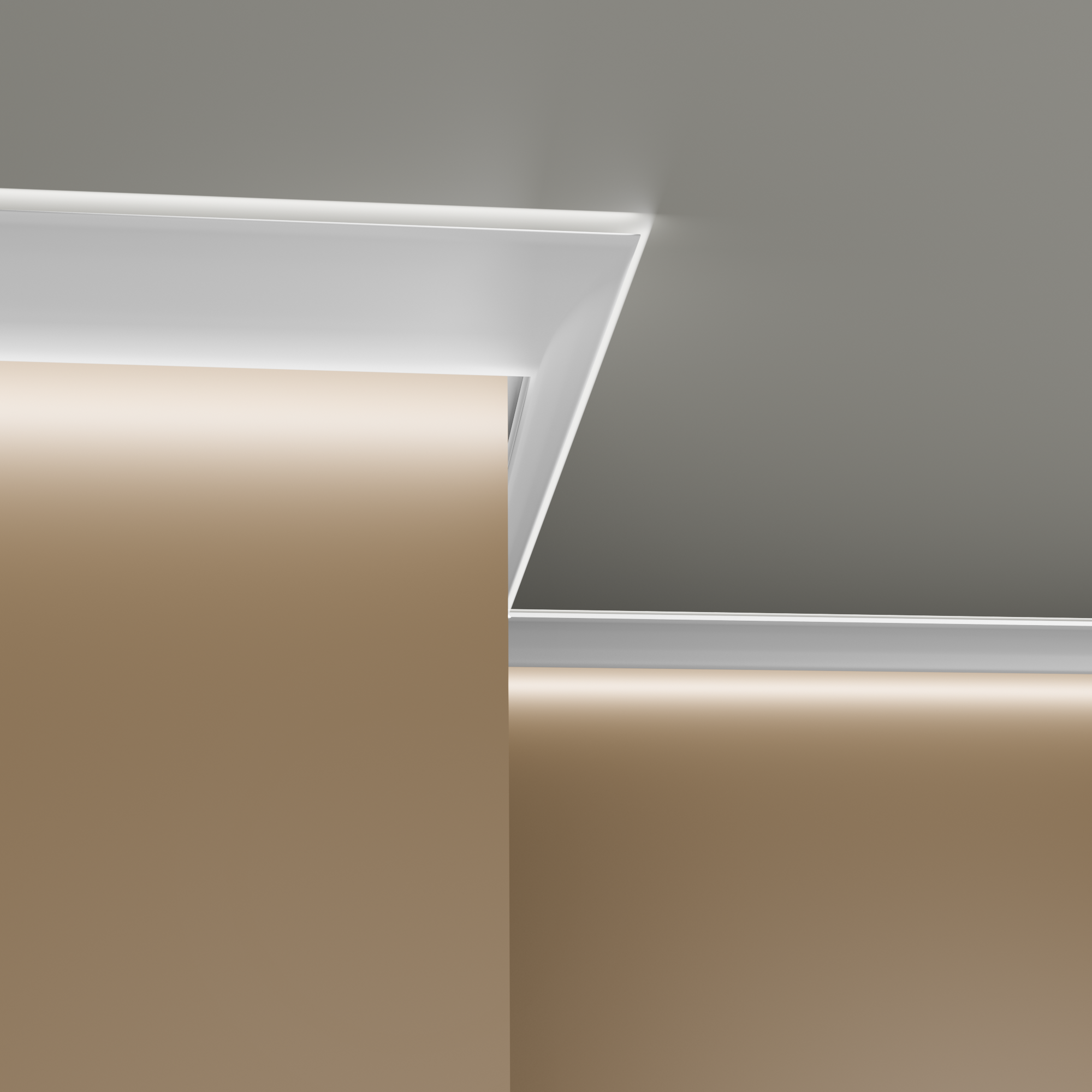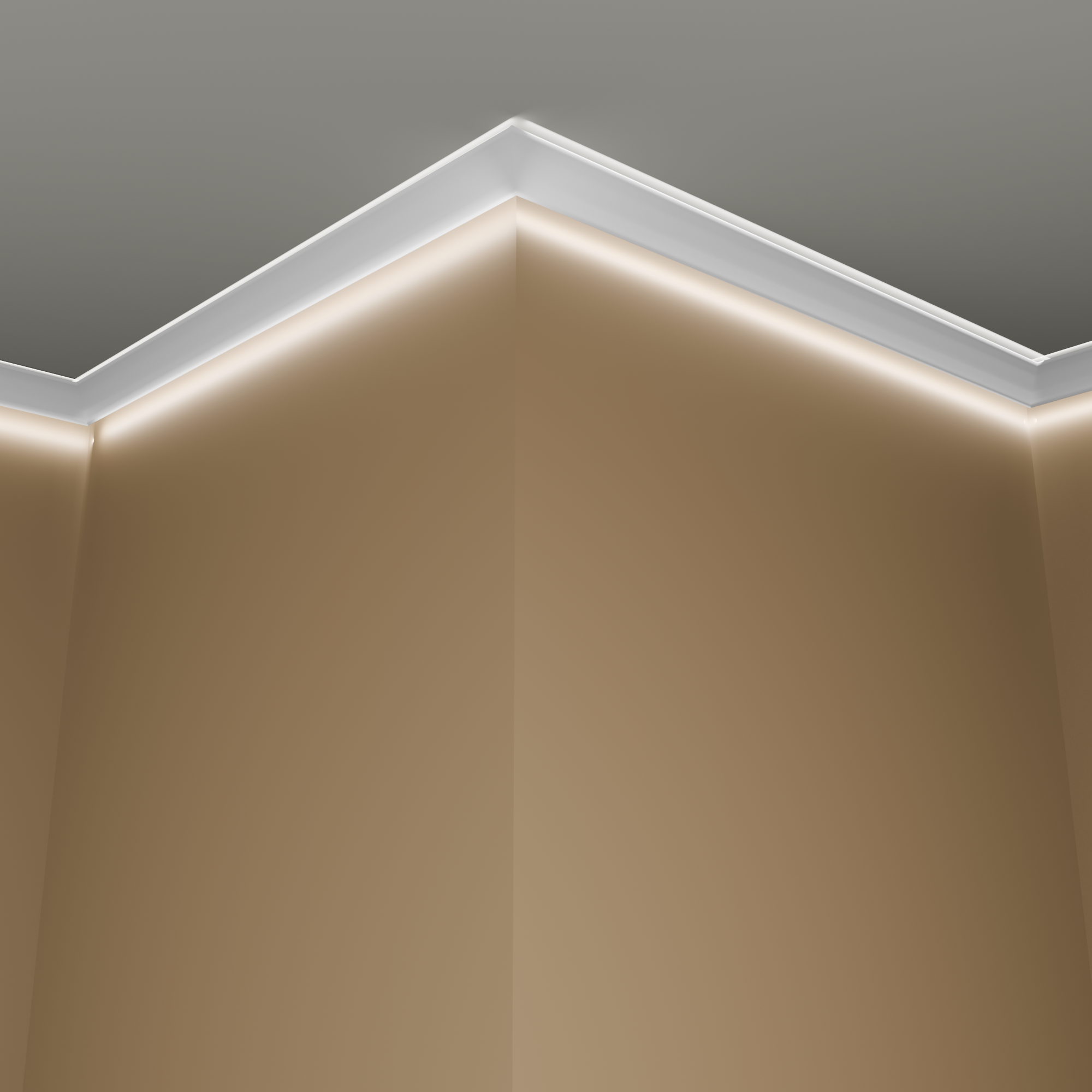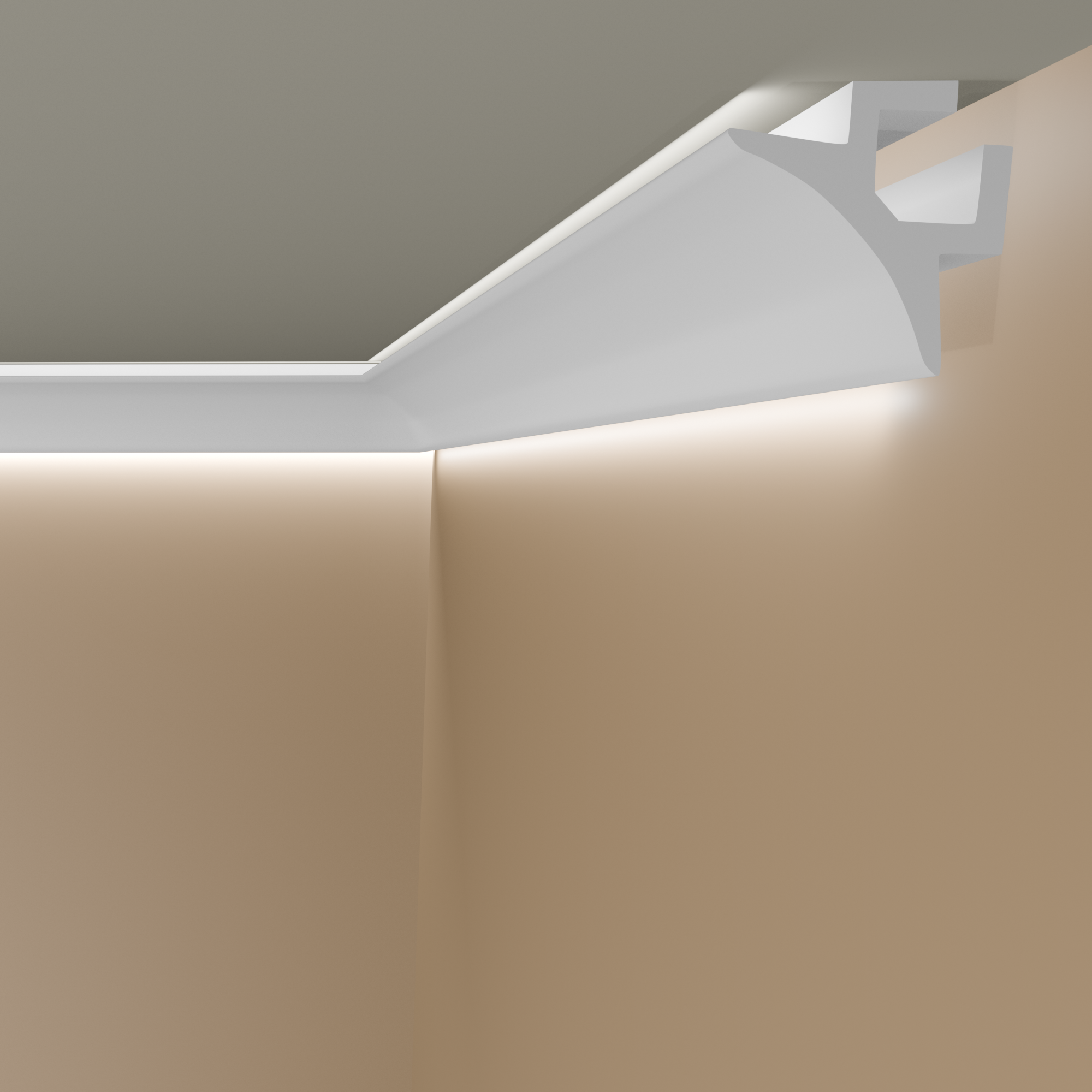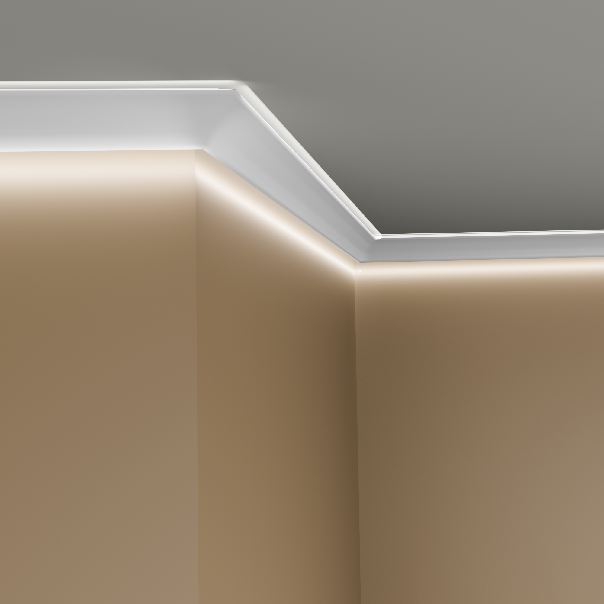 Nos corniches au design moderne et intemporel s'intègrent dans n'importe quel aménagement intérieur. Le design du profil assure une harmonie parfaite entre les murs et le plafond. Vous pouvez insérer des bandes LED flexibles dans la rainure des corniches. L'éclairage LED indirect crée une atmosphère chaleureuse et accueillante. Les accessoires LED assortis sont également disponibles dans notre boutique.