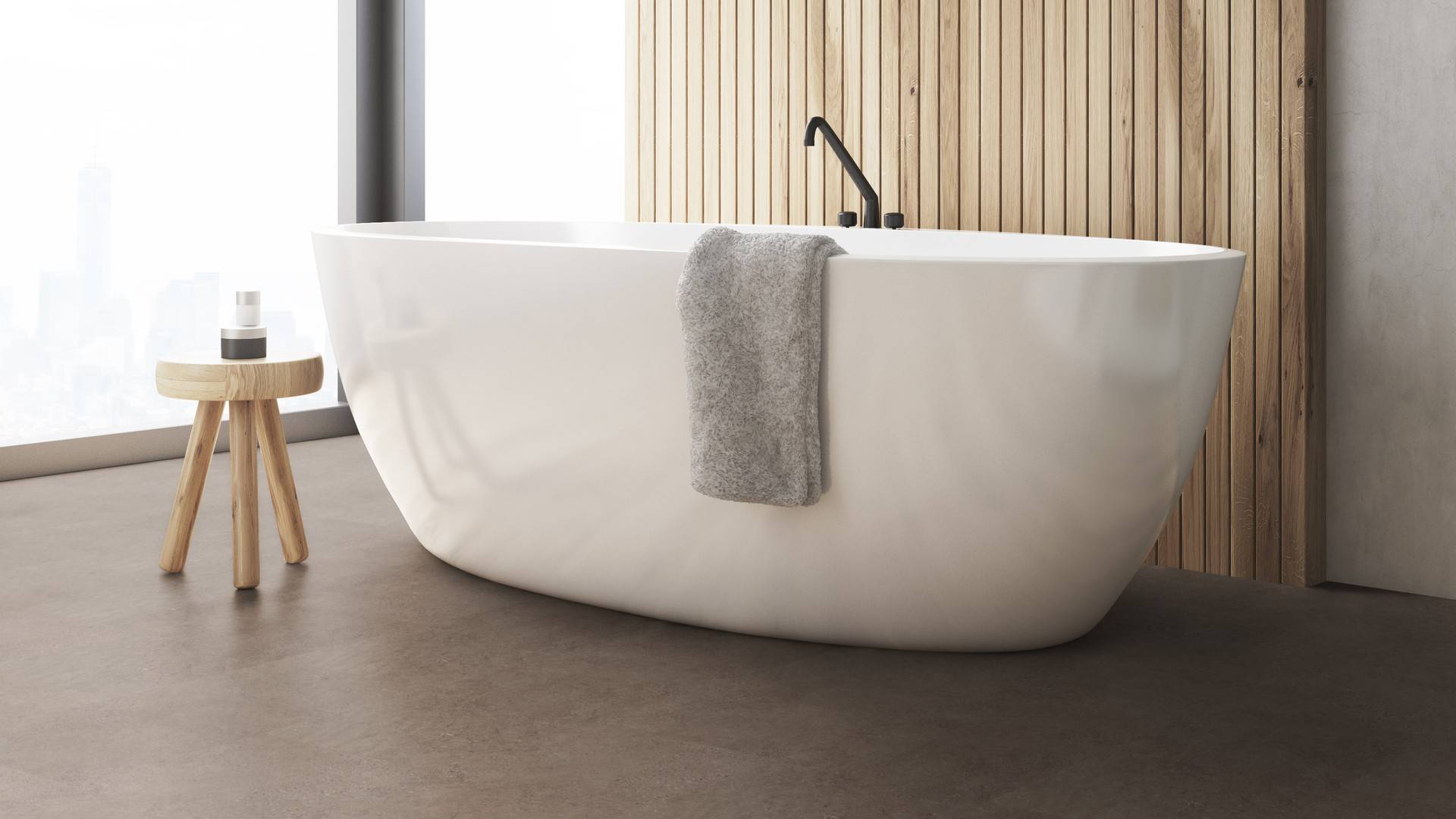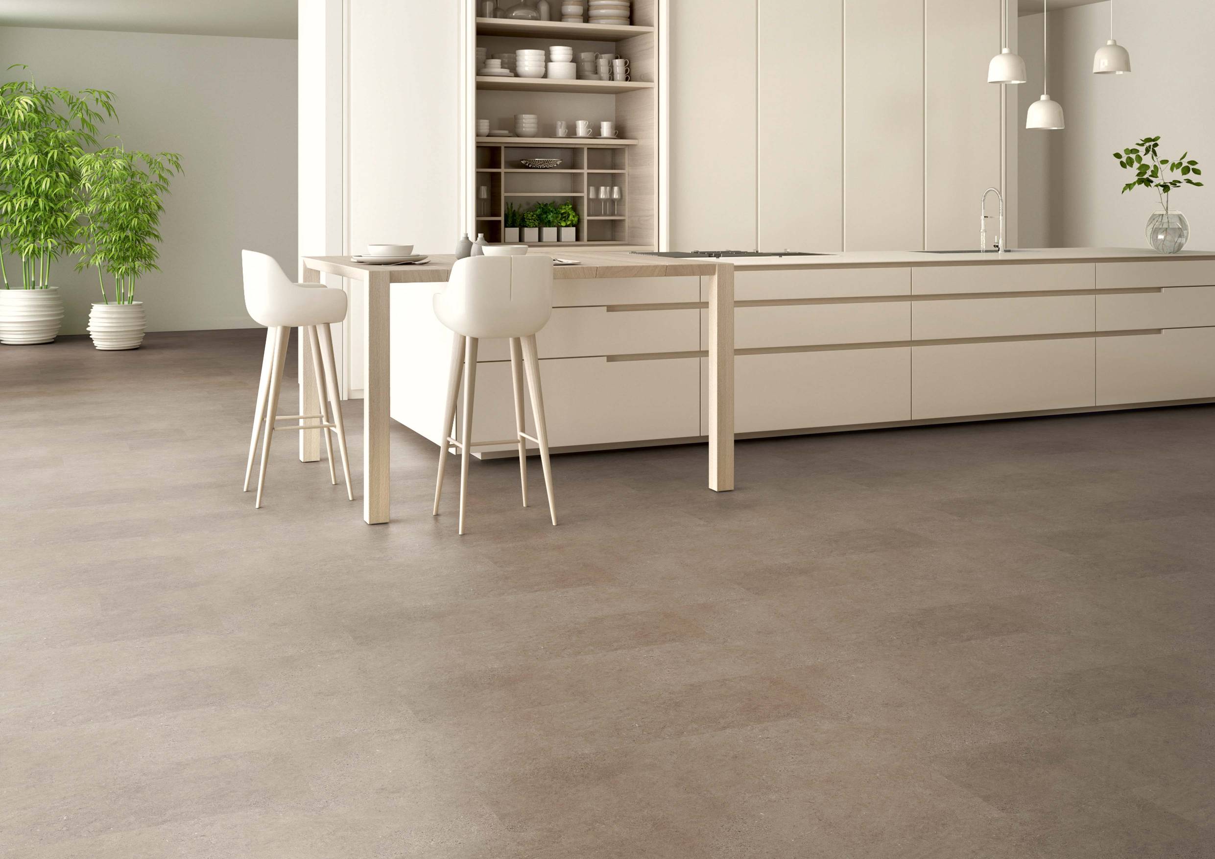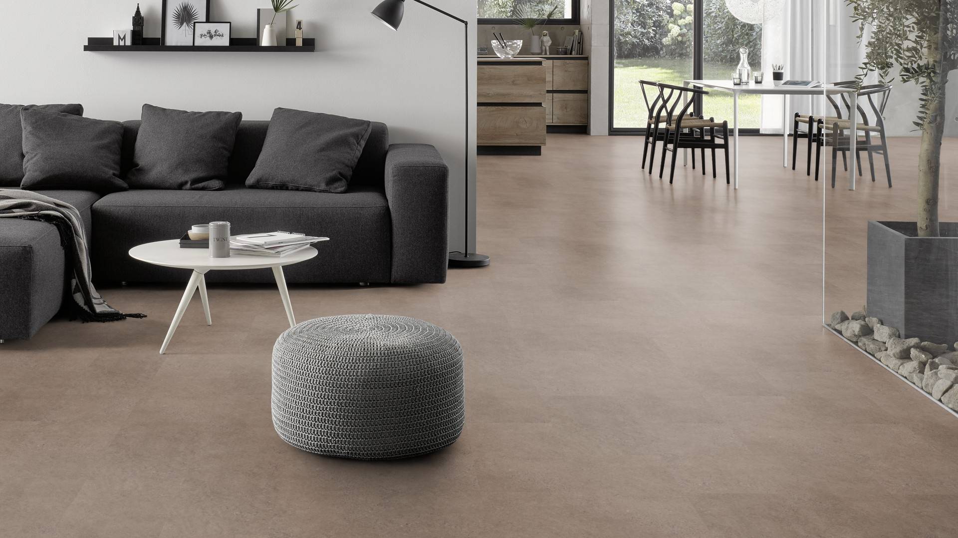Le revêtement de sol en Terrace Concrete séduit par son imitation authentique des sols en pierre et s'adapte parfaitement à tous les styles d'intérieur. La fine structure de la surface donne un aspect de qualité et de réalisme, très proche des vrais sols en pierre et en béton.