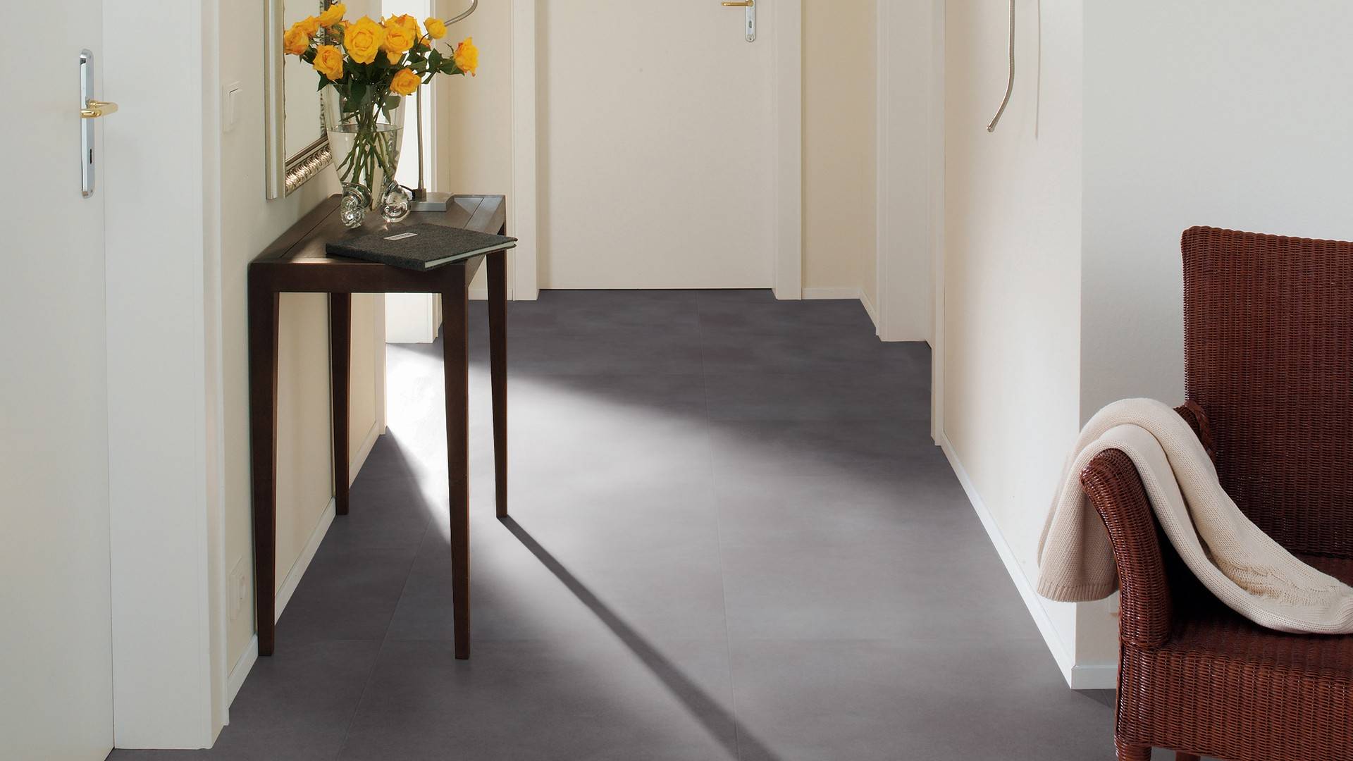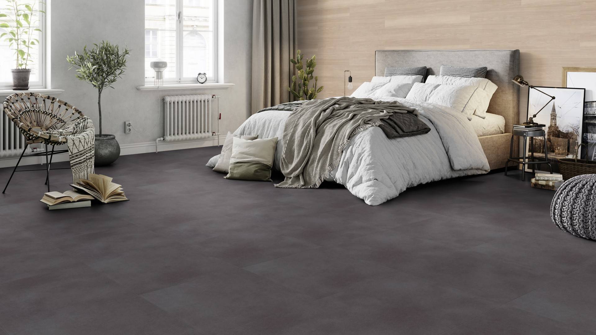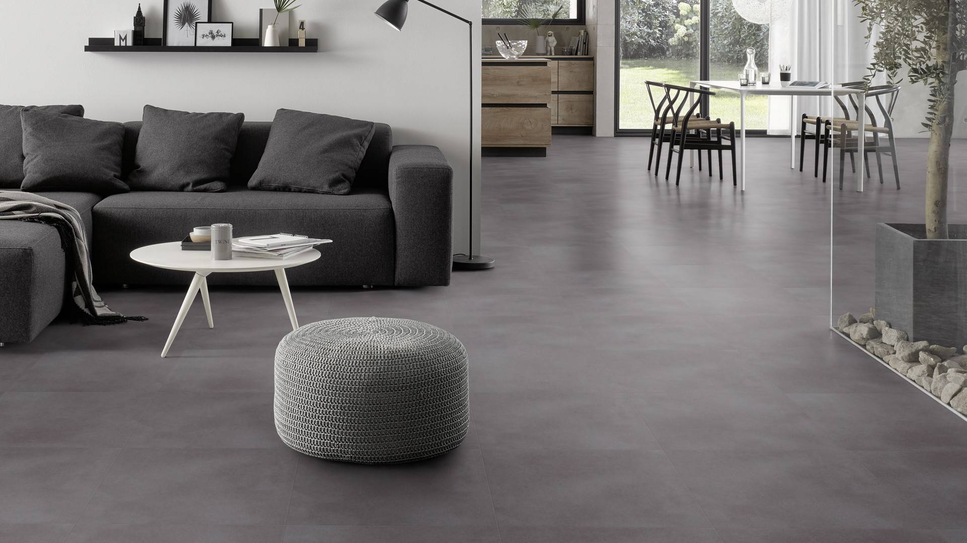 Le revêtement de sol en Dark Grey Concrete séduit par son imitation authentique des sols en pierre et s'adapte parfaitement à tous les styles d'intérieur. La fine structure de la surface donne un aspect de qualité et de réalisme, très proche des vrais sols en pierre et en béton.