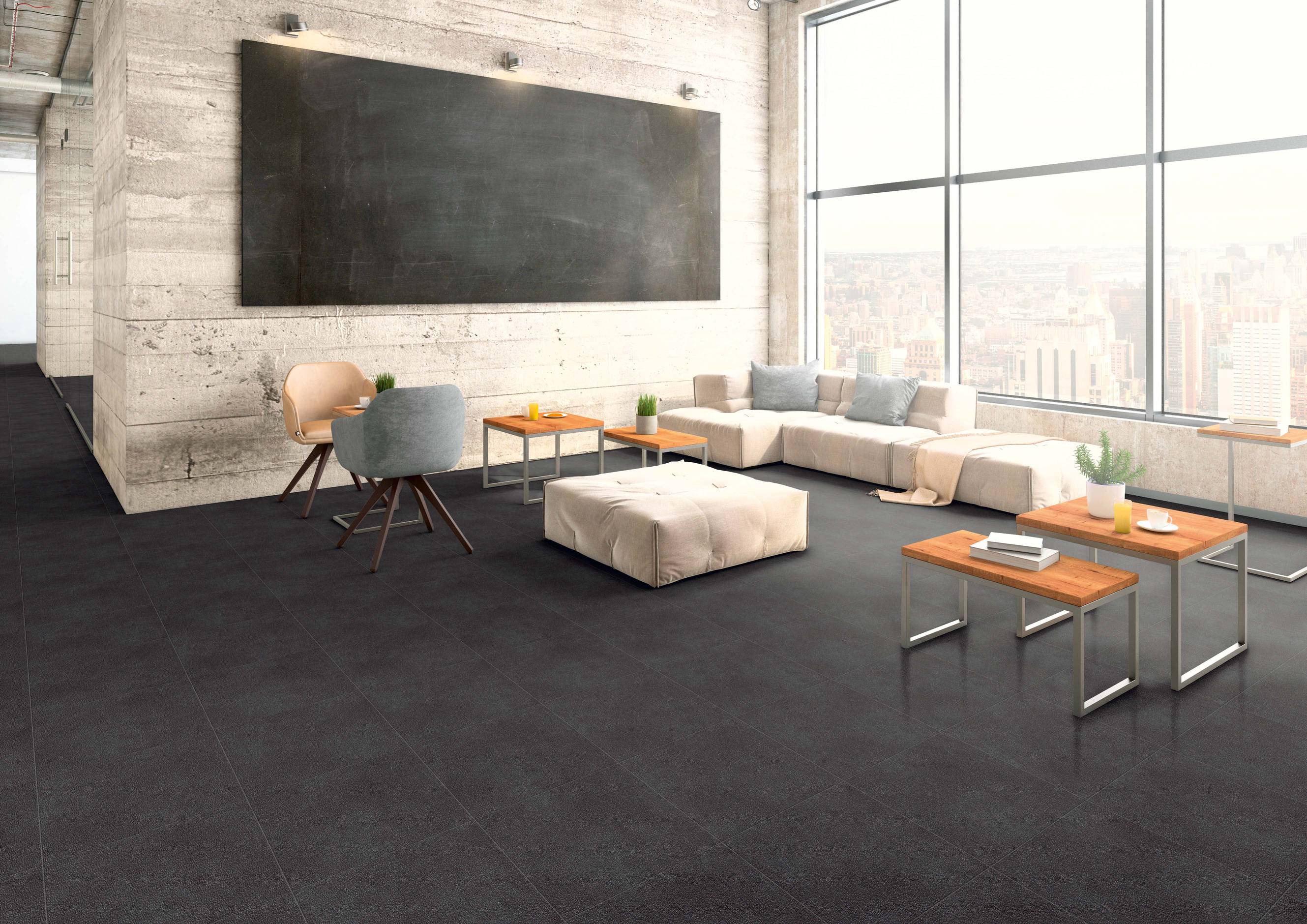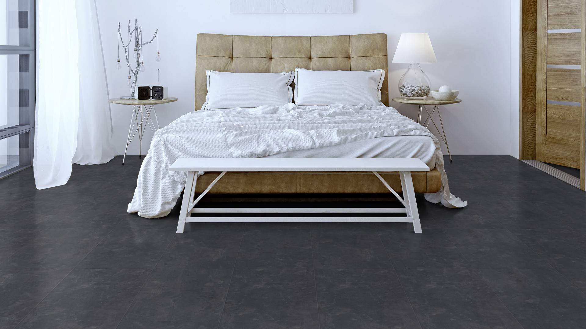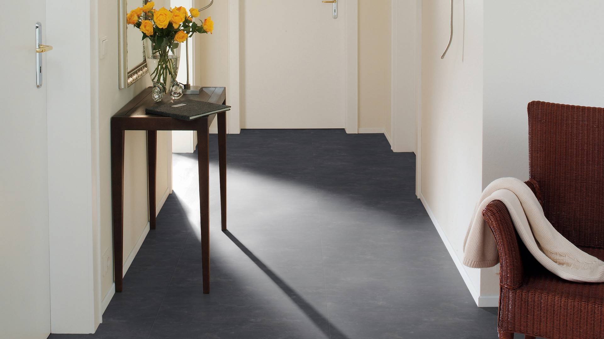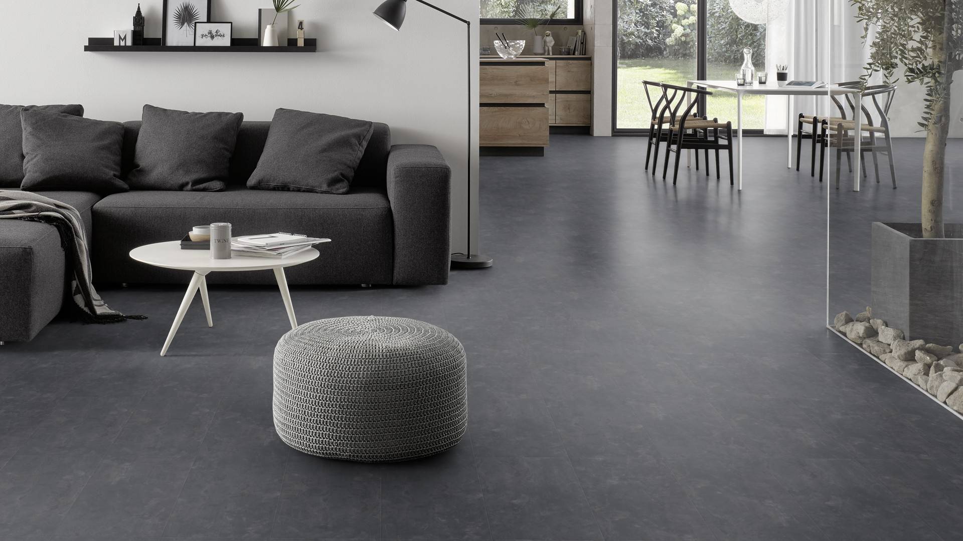 Le revêtement de sol en Black Slate séduit par son imitation authentique des sols en pierre et s'adapte parfaitement à tous les styles d'intérieur. La fine structure de la surface donne un aspect de qualité et de réalisme, très proche des vrais sols en pierre et en béton.