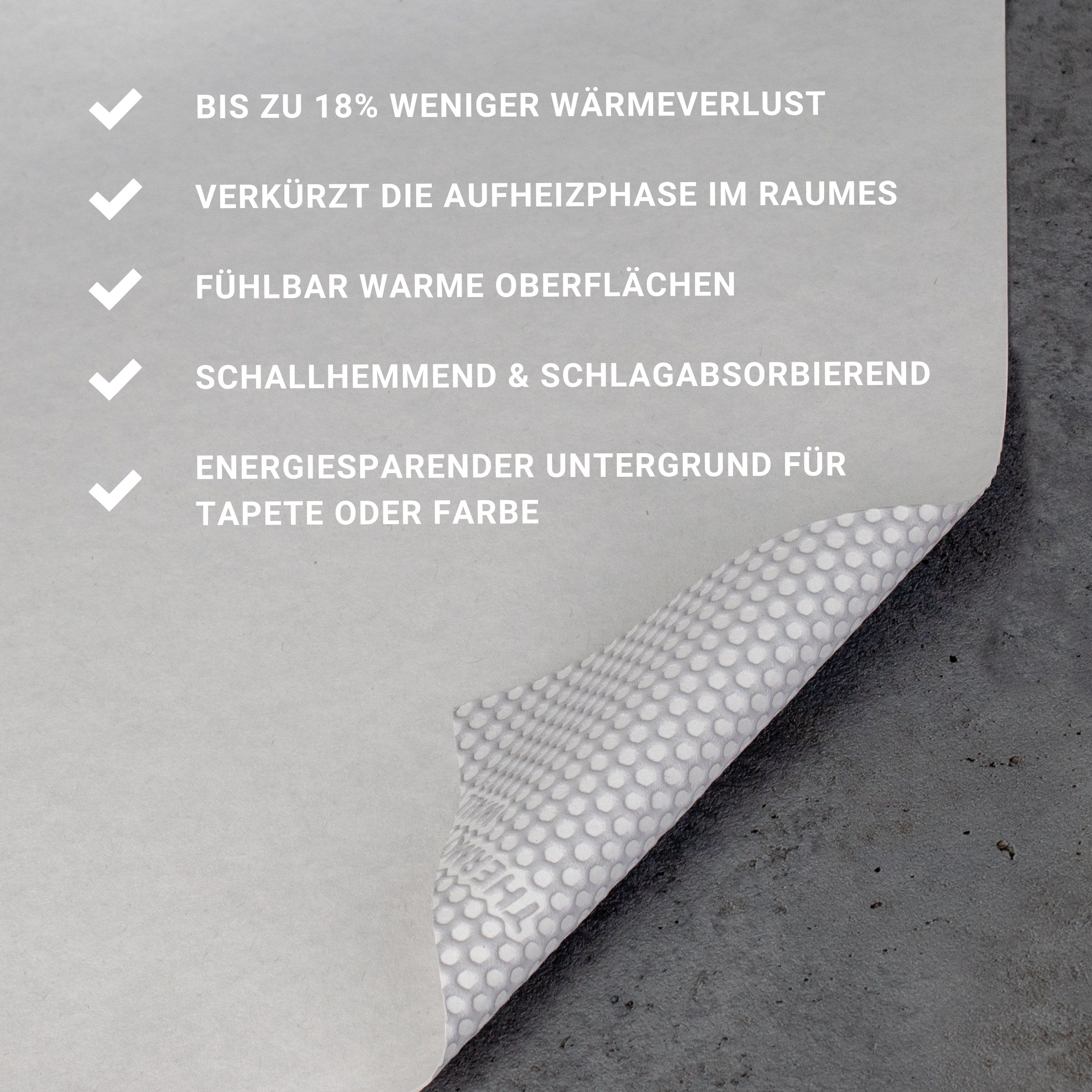 Besonders und Energie sparend: Der Untergrund ist Schlagabsorbierend und Atmungsaktiv. Die Wabenstruktur sorgt für ein perfektes Wärmeverhalten, der Temperaturverlust wird je nach Baumaterial, Außentemperatur etc um bis zu 18% reduziert und der Raum heizt schneller auf. Mit dem Angenehmen, hautsympathischen Material lassen sich kleine Risse und Unebenheiten optimal kaschieren.