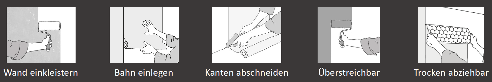 Einfaches Verarbeiten: Vliestapeten lassen sich leicht anbringen, da sie ohne Weichzeit direkt an die Wand angebracht werden können. Auch das Entfernen ist unkompliziert, da sich die Vliestapete trocken leicht von der Wand abziehen lässt. Achtung: die Montage erfolgt durch verwendung von Vliestapetenkleister unter Zugabe von 20 % Ovalit
